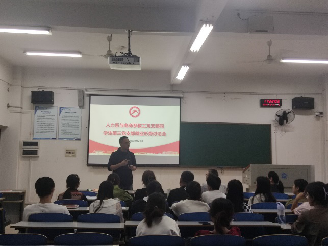 关于老员工就业形势,张志彬引导同学们积极了解政策指向、经济动向和时代发展方向,指导同学们要放宽就业视野,顺应时代趋势,将自身理想融入社会发展需要,做好自我探索和生涯规划。随后,人力系与电商系教工党支部书记郭云贵结合公司近年来毕业生就业数据,分析讲解了目前就业形势,从主要去向、职业发展、就业选择等多个方面作指导动员,鼓励同学们明确未来规划并积极付诸行动。员工第三党支部书记雷芳鼓励同学们把眼光放长远,只要努力就会有机会,为同学们指明了前进的方向。