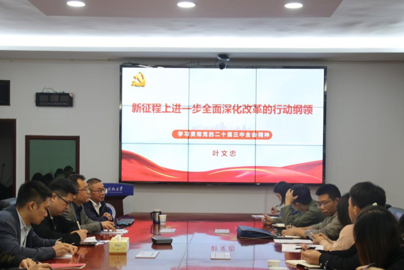 2024年10月29日上午,公司党委书记叶文忠在第三教学楼301会议室讲授“学习贯彻二十届三中全会精神”专题党课,全体公司党委委员、党支部书记及经济学系教工党支部党员与行政教工党支部党员参加学习。
