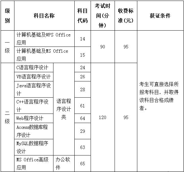 获证条件说明:报考一、二级的考生本次考试成绩合格后即可取得相应证书。报考三、四级的考生在取得相对应低级别的同一类别证书后方可获得三、四级证书。考生可以一次同时报考两个级别考试,同时通过者可同时获取两个科目证书,低级别未通过而高级别通过者,本次不能获得证书,高级别合格成绩保留一次,下次报考低级别考试通过者,可以在下次一起获得证书。