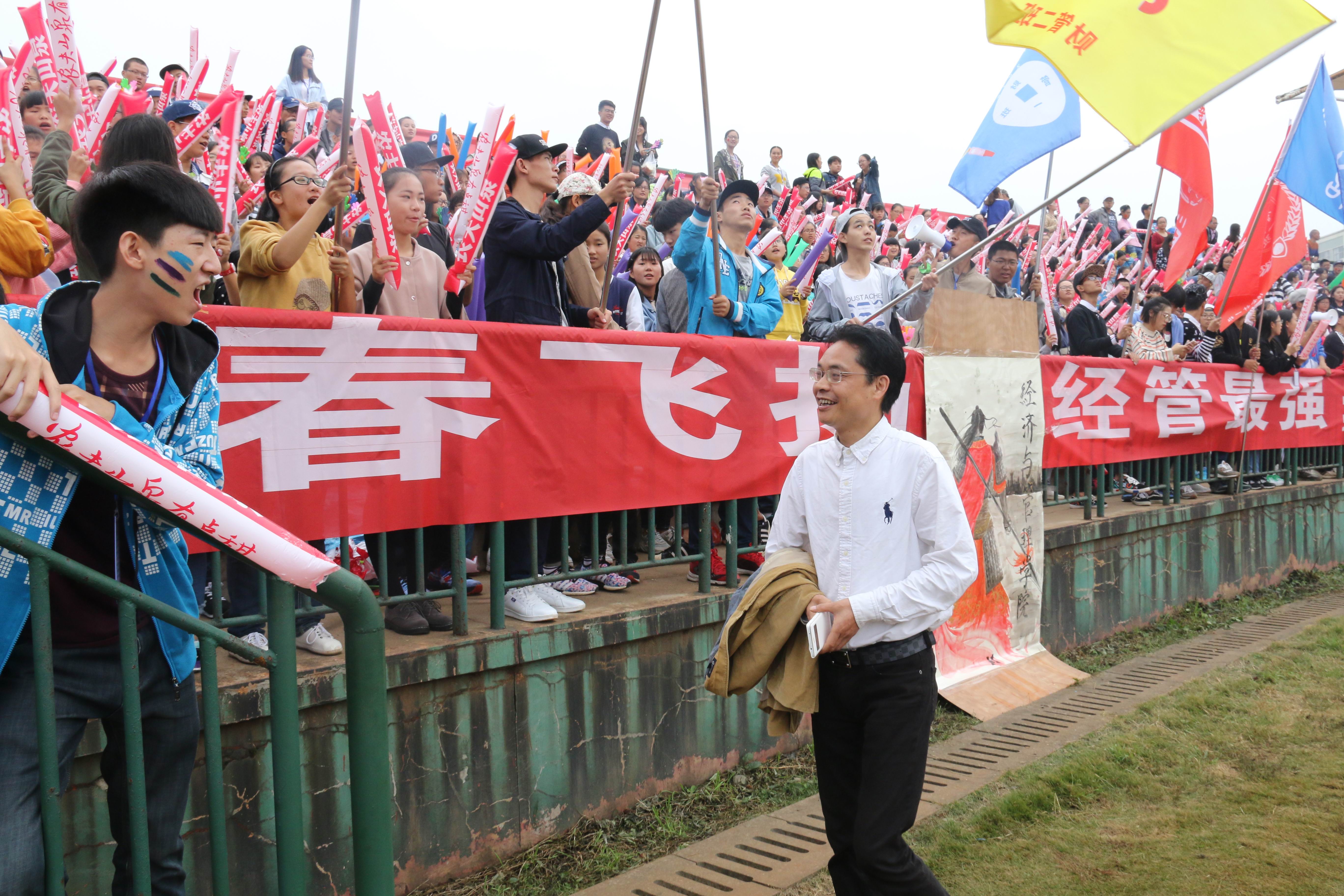 “男神!女神!……”席内的欢呼声经久不衰,众人为经管得胜归来的健儿们呐喊着。教官们也被这盛况吸引而来,撩起袖子为经管健儿击鼓壮威,好不热闹。