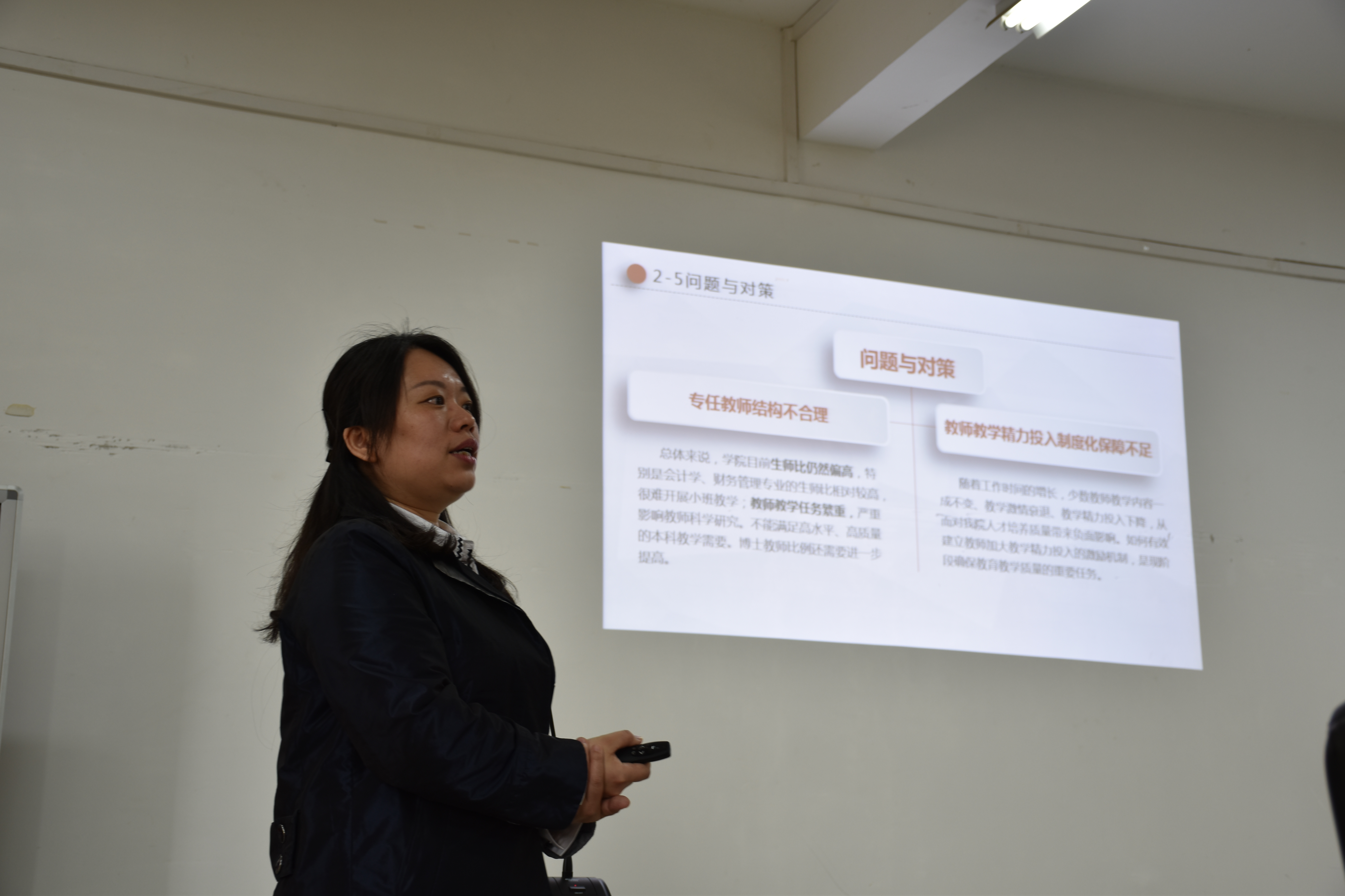 首先,仇怡对公司本科教学审核评估工作进行了工作汇报。在公司自评自建工作开展过程中,全院上下高度重视,制定整改计划,落实整改任务。积极查找目前公司教学及教学管理工作中存在的问题,有机结合自我建设和自我评估,在公司范围内建立起自下而上和自上而下的双向交流和评价机制。并对公司自评自建工作中存在的问题及改进措施进行了重点汇报。对于公司的办学定位与发展规划,她指出yl23455永利的办学定位是突出以“应用”为目标,以“创新”为特征,注重过程与质量相统一、规范与特色相结合,坚持把创新型应用人才教育贯穿于本科员工培养全过程,实行经管融合,以大经管人才观,培养具有国际视野和企业家精神的创新型应用人才。根据人才社会需求优化课程体系,提升实践教学条件,扩展专业教学资源。在教师队伍的建设方面,她强调要关注青年教师成长,提高教师教研教改水平。
