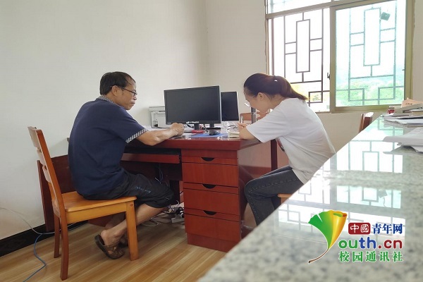 图为贝海妮在采访崇江村党支部书记岑日旗书记