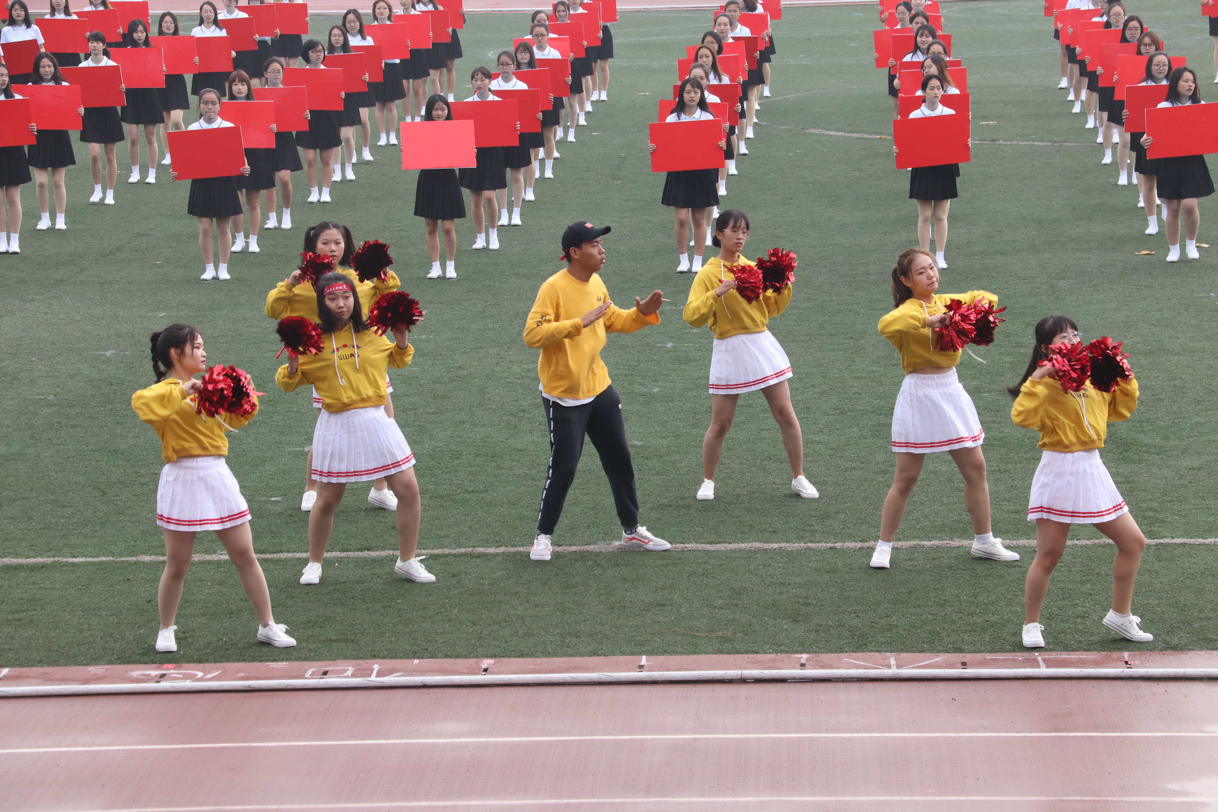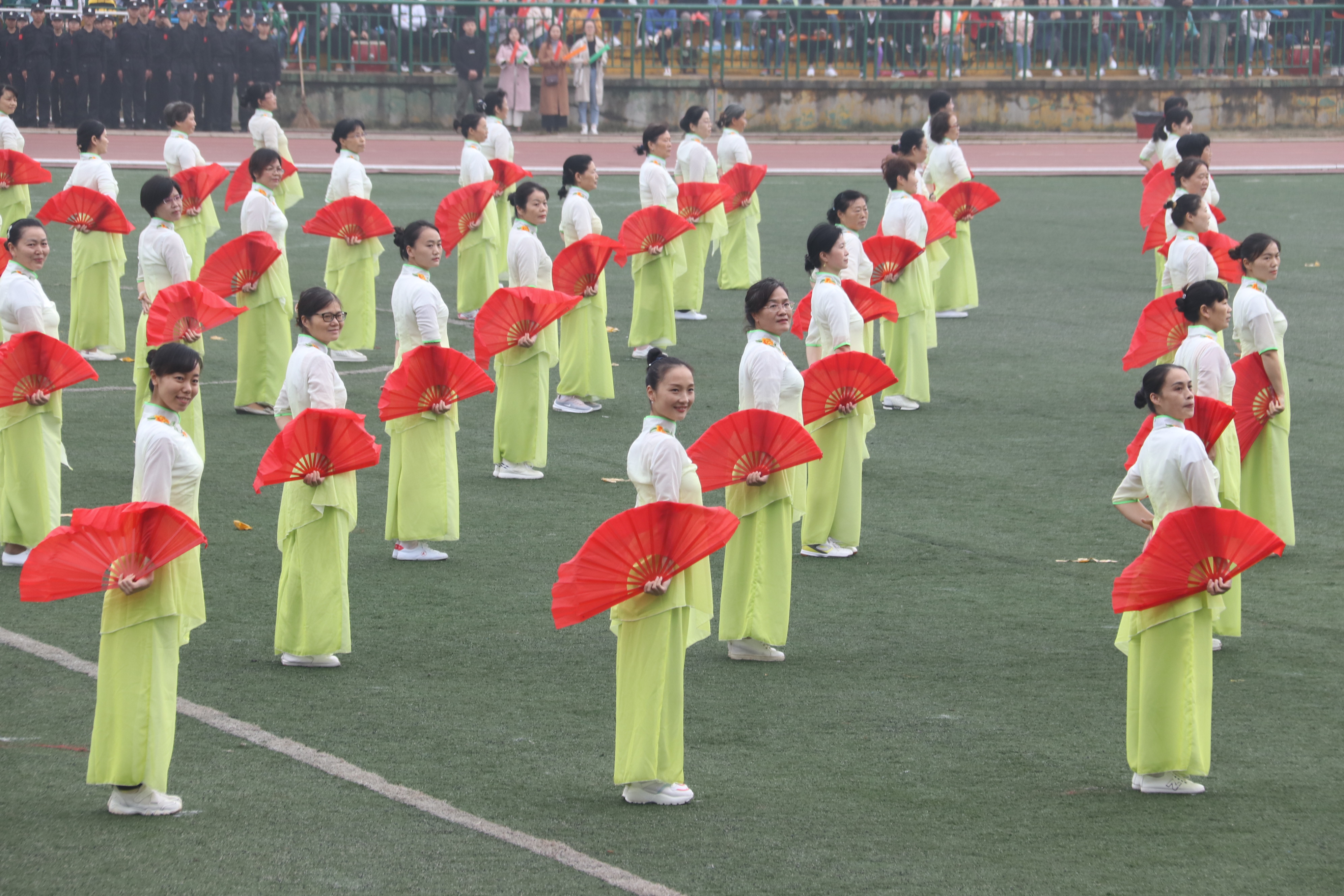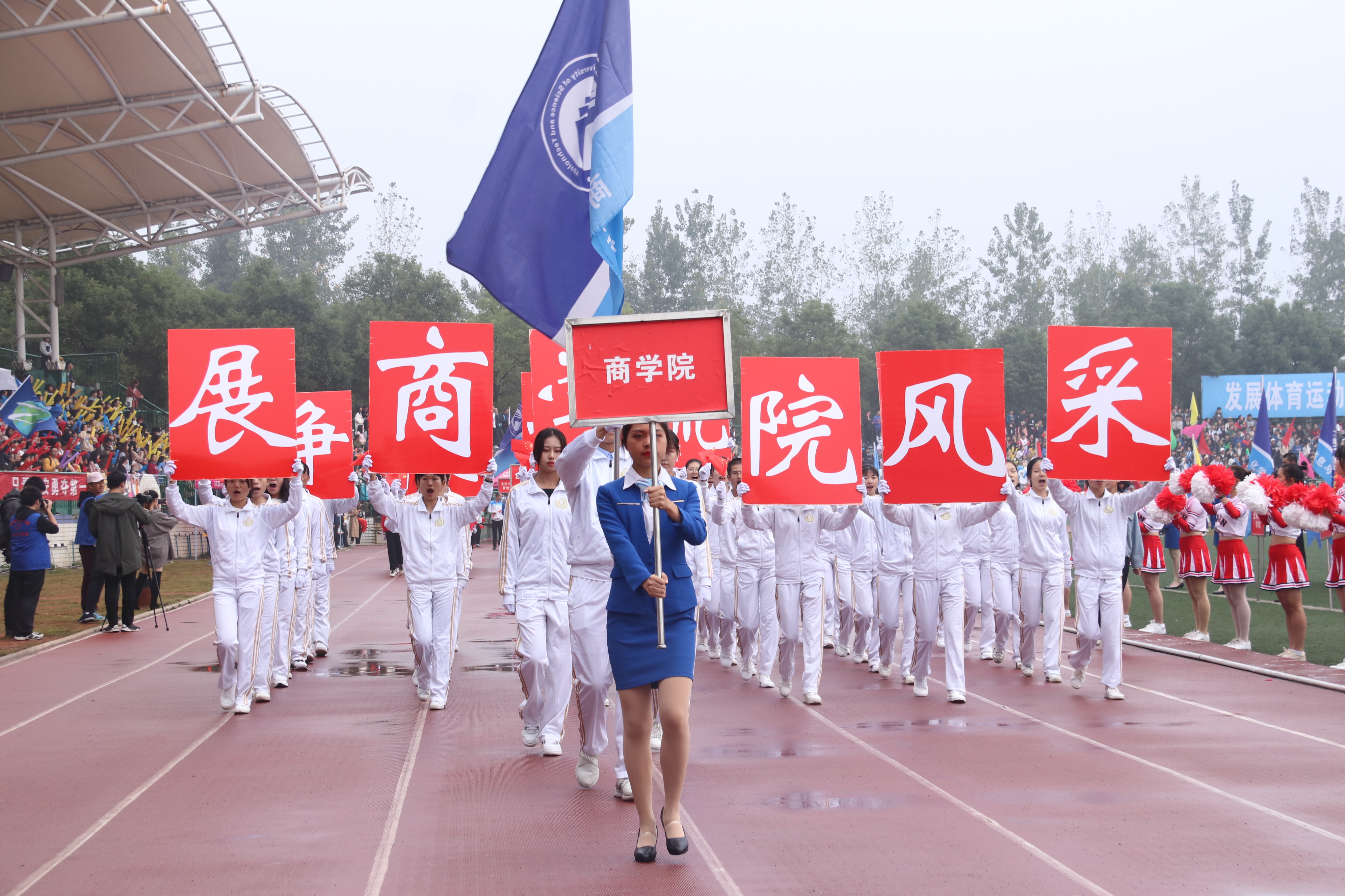 迎着朝露,和着激昂奋进的《运动员进行曲》,比赛裁判员方阵队,各公司方阵队,教职工方阵队依次经过主席台,进行检阅。他们抬头挺胸,步伐坚定。“激情飞扬,凌云赛场,商院独霸,问鼎科大。”气势磅礴的口号,展示着商院别样的风采。身穿白色运动服的商院娇子,手扬红旗,英姿飒爽。恰同学少年,意气风发,他们誓为商院争光。同为商院人,怎无商院梦?观众台上,欢呼雀跃,“呯、呯、咚咚咚……”加油声,鼓声响彻云霄,回荡不已。