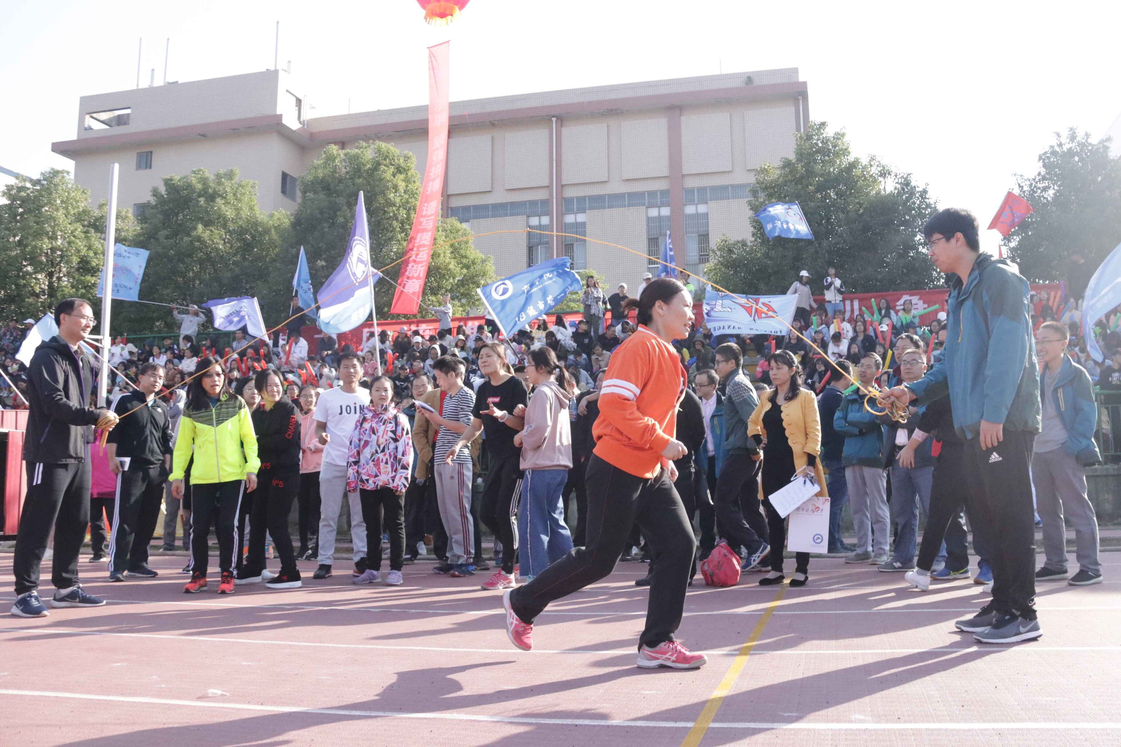“请各教职工注意,比赛马上开始。”广播声响起,随着“呯”的一声枪响,早已准备好的老师们迅速行动。助跑、看准时机、跳,动作一气呵成。转弯、排队,接着再来。划绳人与跳绳人相互配合,默契十足,再创佳绩。
