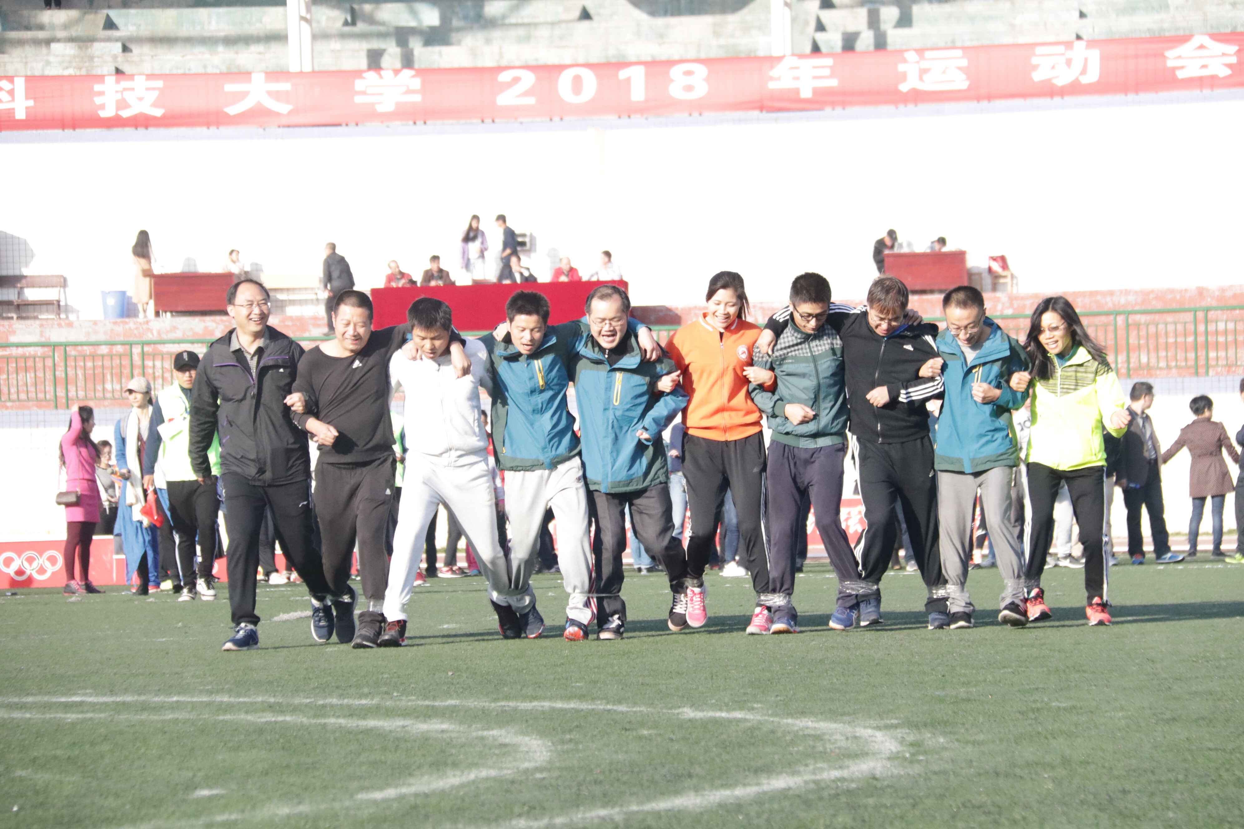 首先进行的是“十人十一足”比赛,yl23455永利参赛老师在比赛前便如火如荼的进行赛前准备。他们排成一排,用透明胶带将自己与相邻队员脚部绑紧。这条胶带,绑的是腿,连的是每个老师的心。枪声一响,老师们手搭手,肩并肩,大步向前走。