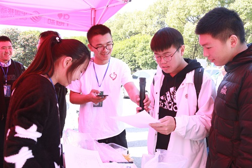 工作人员的精心布置引来了许多同学的驻足,各类特色小游戏和精美礼品吸引越来越多的同学参与其中。在幸运大转盘前,一个女生转到了“谢谢”二字,工作人员调皮地调侃道:“恭喜你获得了大转盘唯一的‘谢谢’,你真是太‘幸运’了哦。”在吃柠檬读绕口令处,参与者被酸到“扭曲”的脸让周围人忍俊不禁,纷纷拿出手机来记录下这“美好”的一刻。同学们踊跃的参与以及现场工作人员积极的配合,使得现场气氛一度火热。