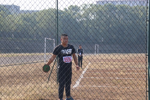 哨声响起,比赛正式开始,场上气氛紧张,场下欢呼一片。随着红旗的落下,运动员赵云涛双脚开立,右腿稍后,右手持饼采用左上右后的方式摆动,随后,他右腿用力一蹬,将力量集中于手臂,掷出铁饼,使其在空中划出一条完美的抛物线,随后重击地面。三次成绩,一次比一次优异,观赛人员不禁发声:“这个实力不错!”而其他运动员也都拼尽全力,进行左上右后或身体前后的预摆,借力掷饼,展现雄厚的臂膀力量,现场比赛境况异常激烈。最终,赵云涛成功进入决赛并以23.00米的好成绩荣获第七名。