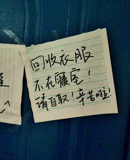 部分同学因时间冲突便早早准备好旧衣物和便签并托室友帮忙捐赠,这部分同学留下的不仅仅是衣物和便签,更是人与人之间爱与温暖。