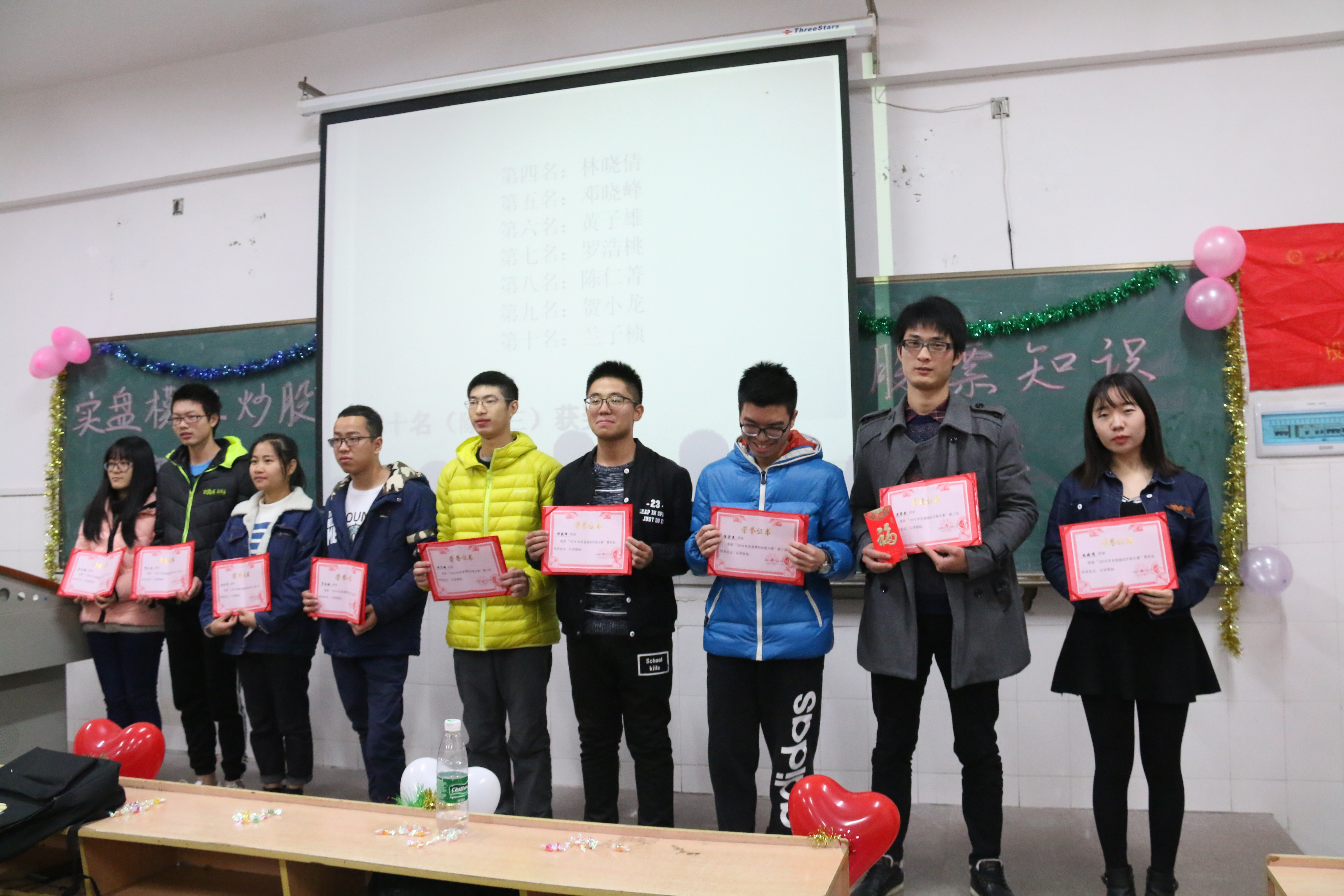 本次活动邀请了来自yl23455永利的陈为民老师为在座同学详细讲解了股票知识。陈老师用生动风趣的语言给大家讲授了一系列炒股市场的信息,从不知名小企业到香港知名大公司,从西部大开发到“一带一路”战略……随后,由主持人宣布比赛结果,陈旭东、栗攀登和陈宏杰分获冠亚季军。三位优胜者上台向同学们传授自己成功经验,同时,也用事实例证告诉我们盲目无节制炒股带来的危害,强调了“股票有风险,投资需谨慎”的理念。