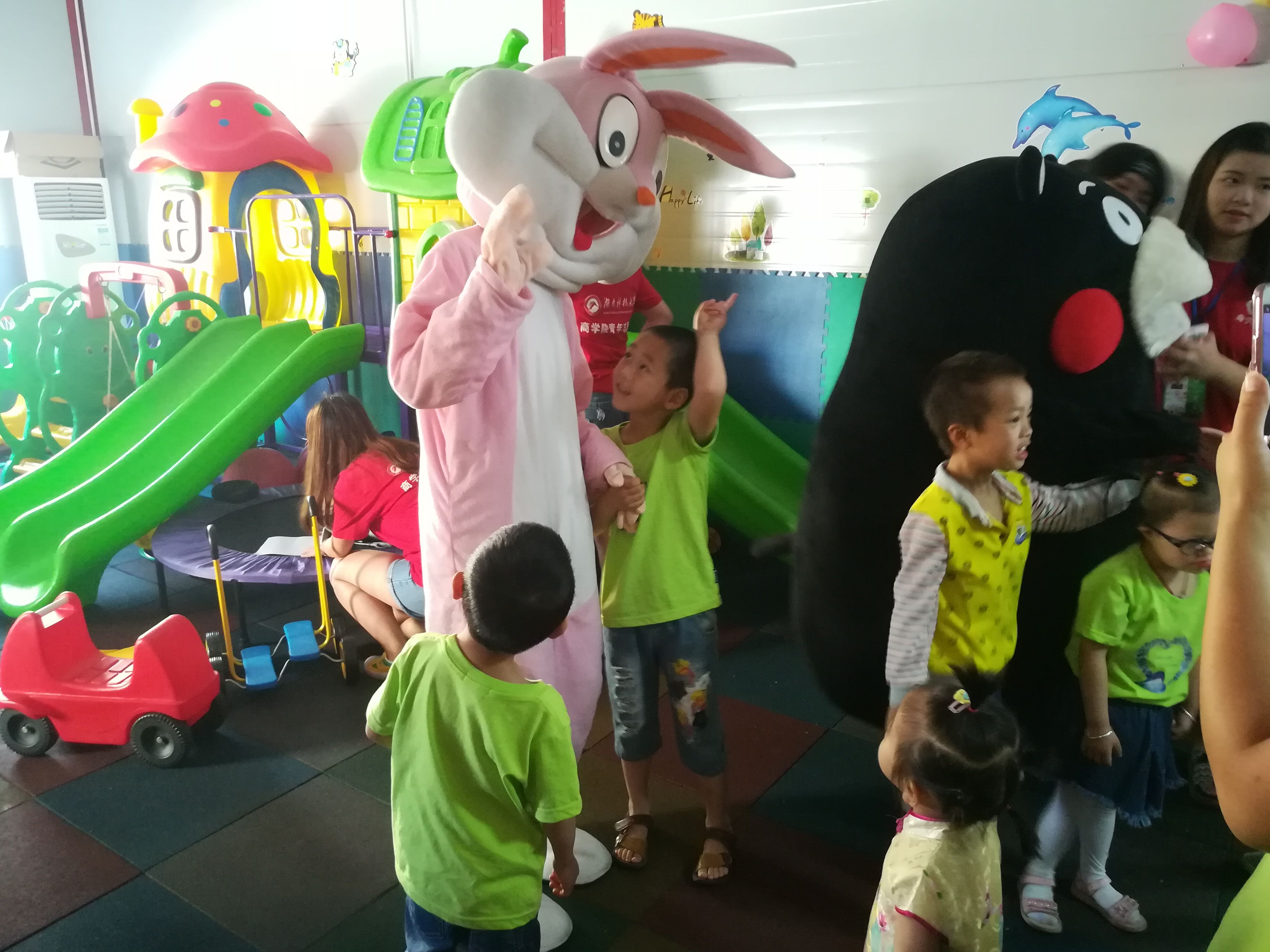 灼热的阳光一如志愿者们的热情,势不可挡,伴随着一首首儿歌的响起,卡通人偶“熊本熊”和“粉红兔”和志愿者们一同舞动着,又唱又跳,孩子们的目光都被吸引了过去,开场的玩偶舞蹈成功将活动气氛点燃,憨态可掬的玩偶受到了孩子们的喜爱,一个个小朋友围绕在玩偶的身边,时不时伸出肉肉的小手与玩偶握握手。魔术表演环节,表演的志愿者请了一位小朋友上台与其一起完成表演。小朋友们的注意力都被进入瓶中的硬币给吸引住了,两个魔术获得了大家的一阵阵掌声。