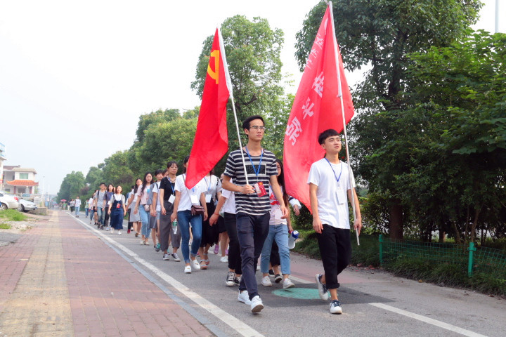 早晨7:30全体人员集合完毕,准时开拔。在刘彩老师的带领下,同学们重走红军长征路,从三教出发走二环线,到桃园路口转建设北路,一行人步行70分钟到达湘潭烈士陵园,在炎炎烈日下体验红军艰苦卓绝、百折不挠、英勇无畏的革命精神。