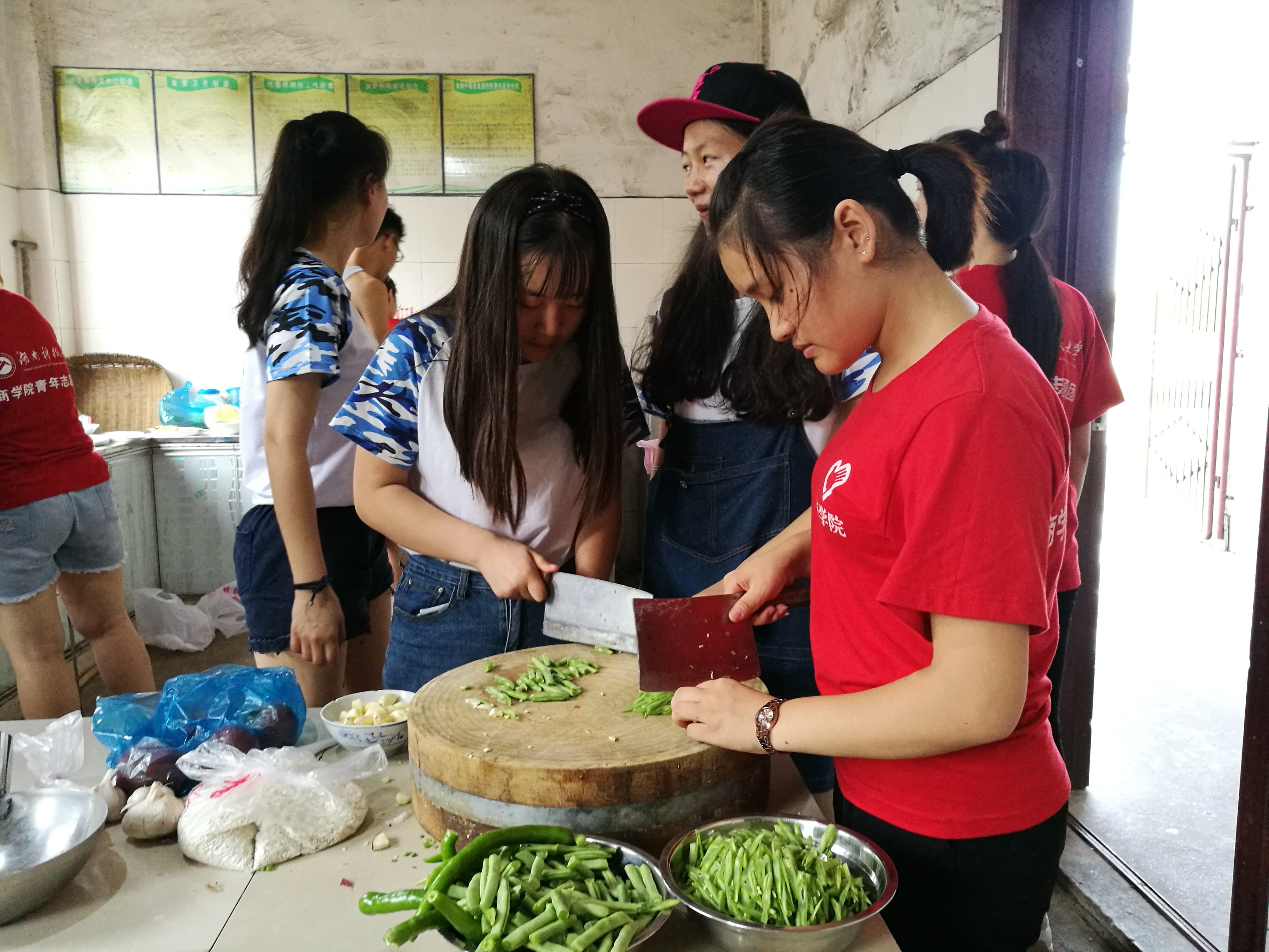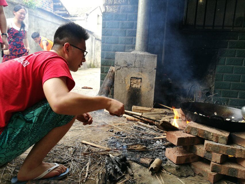 第一餐以爱心面条为主食。所有人围坐在桌子旁,奔波劳累的志愿者都吃得津津有味。饭后还有甜甜的大西瓜,员工会主席仲鹏也忍不住拿起菜刀一刀劈开了西瓜,引起了大家的一阵欢呼。午后的小憩为接下来的工作养足精神做好准备,而后又投入到忙碌中。有的在对乌石镇进行实地调查,有的在为接下来的活动练习舞蹈、排演节目。晚饭到来前,架锅、砍柴、生火、切肉、烧菜,构成了一幅农家烟火图。“三下乡”活动负责人张苏伟拿起了斧头砍柴,大家纷纷过去围观,斧头因不牢固反复脱落,他却说道“要想先劈柴,先修好斧头。”辛苦过后,香喷喷的炒鸡肉、烧茄子、玉米汤,满满一桌子的丰盛晚餐呈现在眼前。大家在院子里享受着阵阵微风,举杯共饮,为本次"三下乡"活动加油,为接下来更加艰苦的生活鼓劲,为第一天的收获庆贺。