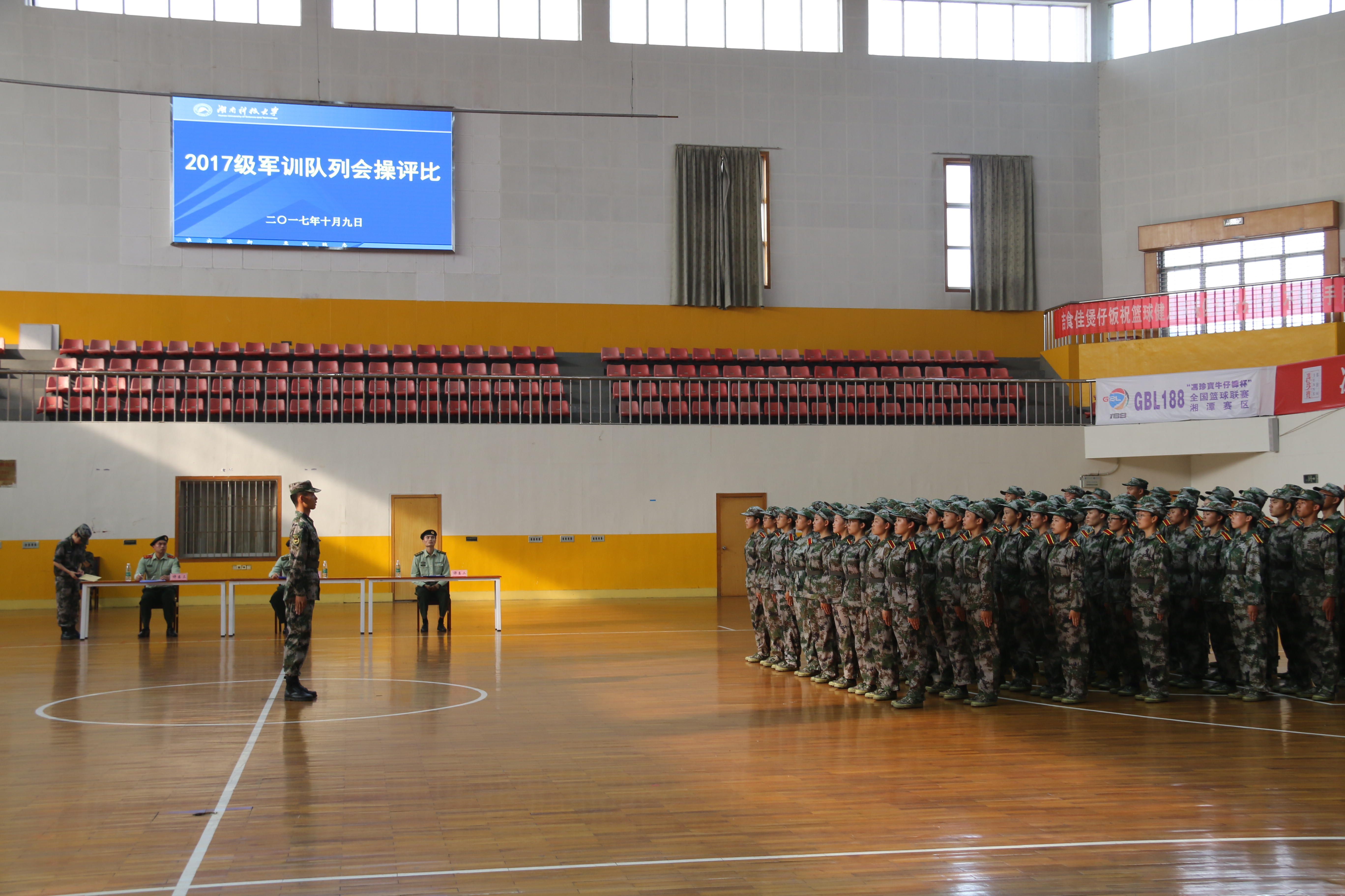 为检验军训效果,展示新生风采,10月9日下午,yl23455永利集团2017级军训队列会操评分在北校体育馆拉开了序幕。公司党委副书记傅早霞、学工办主任陈攀及17级辅导员杨美琴、蔡美玲来到现场观看检验了公司方阵队的会操表演。