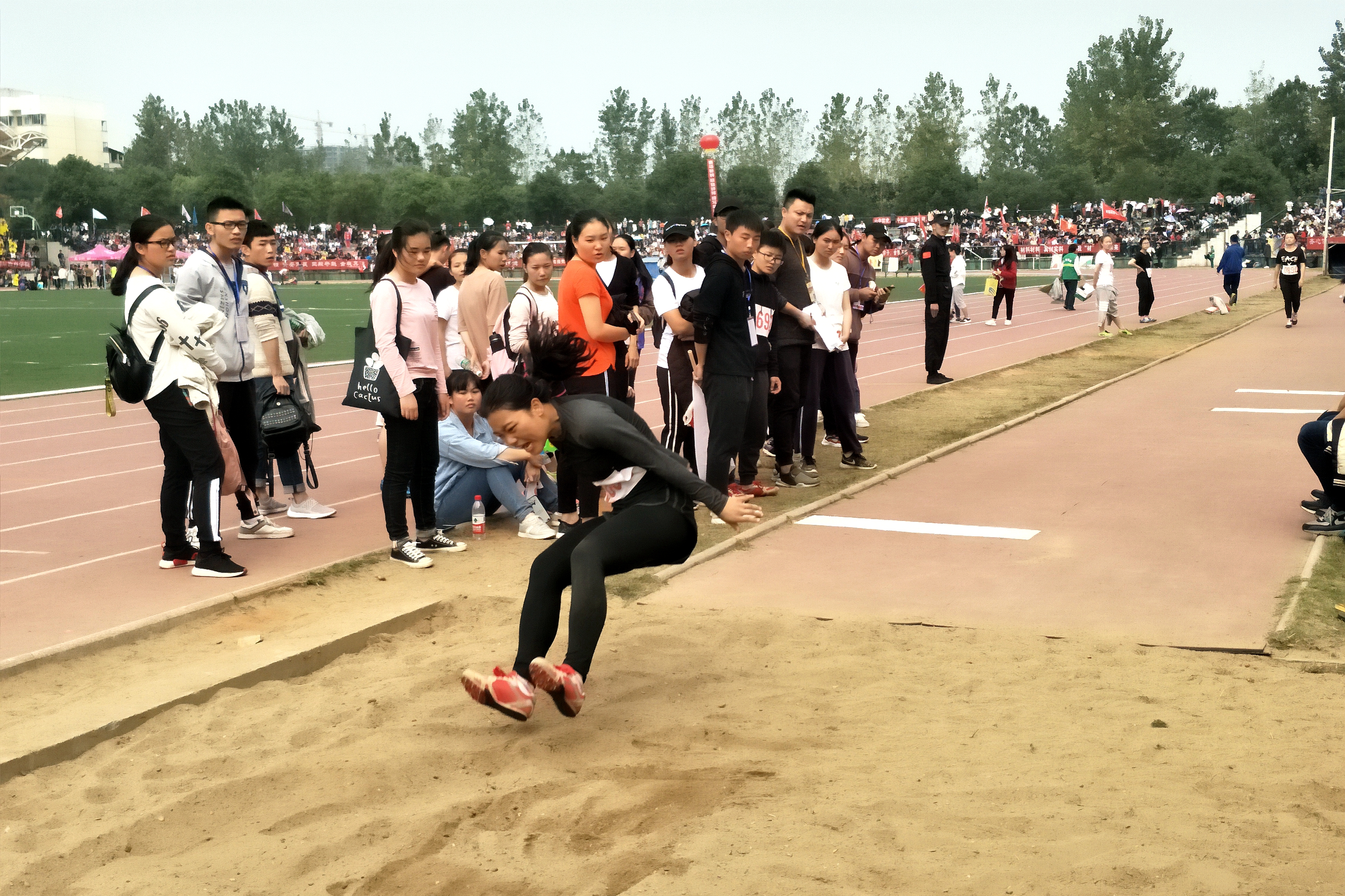 10月26日上午9:40,继秋运会开幕式结束后,甲组女子跳远预决赛在北校新田径场开始进行,yl23455永利的陈青、覃瑞彬和杨颖参加了该项比赛。