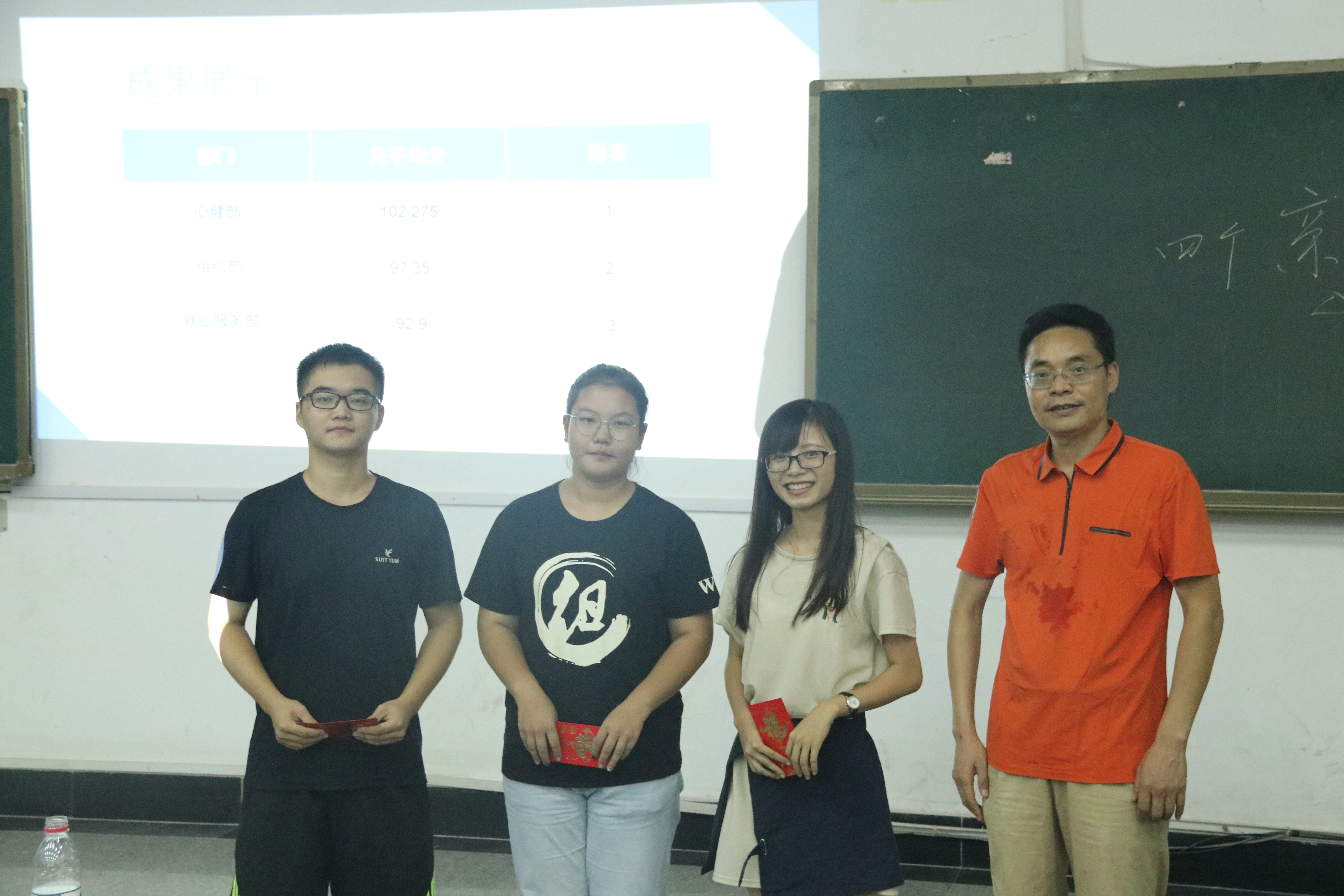 大会分为四个环节,分别为干部考核、主席讲话、书记讲话及奖金颁发。大会上,干部代表崔美琪负责介绍考核内容及其情况,在上一学年考核中获得前三名的部门为心健部、体育部、就业服务部,由傅早霞书记为其颁发奖金以资鼓励。yl23455永利员工会主席翟广达要求广老员工干部要有积极向上的意识,提醒志愿者们要注意迎新形象,同时在接下来的卫生检查、主题班会及第一次课中要做好准备。