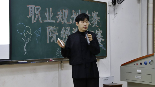 比赛分为选手PPT展示和评委提问两个环节。在PPT展示环节,选手们根据自我认知、环境分析、目标设定、行动计划等方面进行了详细的阐述,运用霍兰德职业测试、MBTI等工具制定出符合自己的职业策略,并有针对性地规划自我职业路径、计划自我监控方式。