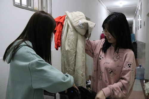 在志愿团副团长郭劲锋的统一安排下,志愿者被分组派往宿舍进行收集活动。每个小组负责两个楼层,志愿者本着服务他人的初心,一一敲门,耐心宣传本次活动的意义,给每一位有意向参与活动的同学提供了奉献爱心的机会。在活动开展过程中,有许多同学向志愿团热情地打招呼,还有许多同学对志愿活动的细节非常感兴趣,进行了详细地询问。随着衣物收集活动的持续展开,收集到的衣物也不断增加,越来越多的人受到了活动的感染,积极地参与到了此次活动中。衣物收集结束后,志愿者们在指定位置集合并将衣物包装好,送至预定车辆上,由志愿团副团长石浩飞送往第三教学楼118办公室进行集中管理。到达118办公室后,志愿团的成员共同商讨衣物的安排和分配问题以便下一步活动的进行。