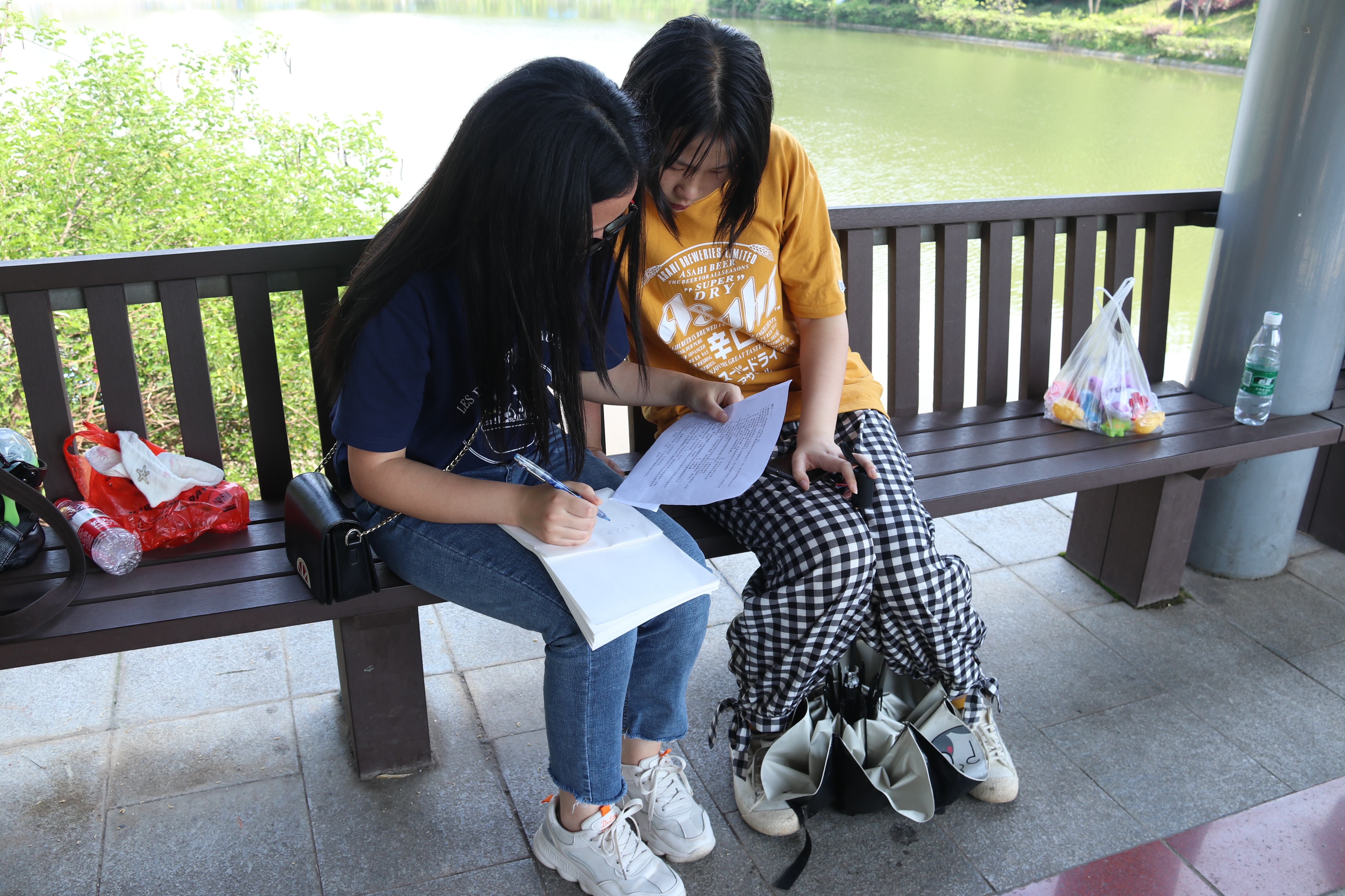 比赛伊始,各队伍接收监督员发布的第一个地点线索后,火速赶往指定地点。当到达第一个指定地点——南图时,“你划我猜”与“官兵捉贼”指定任务正有序进行,A队凭借极高的默契度与明智策略迅速完成了指定任务,与工作人员合影后马不停蹄赶往下一个指定地点。随着,映入眼帘的是第二个指定打卡地点——太阳湖。该地点的两项任务“正话反说”与“一口气读完一段话”极具挑战性,在场三支队伍相继挑战失败。但炎炎烈日并未击退队员们前进的脚步,反之,做好充分的准备后重新再战是他们的选择。第三个任务指定地点便是君桥。“夹玻璃球”与“成语接龙”两项任务旨在考验队员们在紧张的比赛氛围中能否够以平和的心态面对任务。而到达第四打卡地点——明湖后,队员们大都体力不支,但大家未轻言放弃,仍以高涨的热情投入,认真思考、积极参与、沉着应对是大家比赛过程的真实写照。此次户外解密寻宝终点设置在第十教学楼,“给关键词,背古诗”与“给关键词,唱歌词”两项任务也进行得如火如荼。
