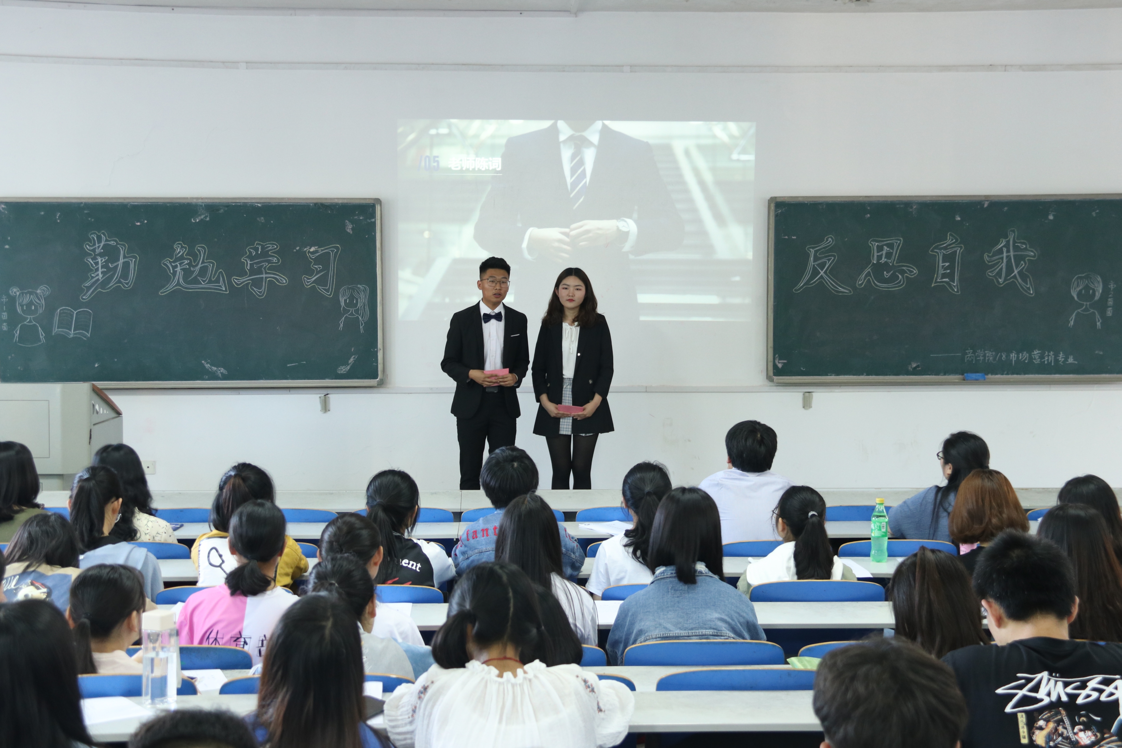 2019年5月10日16:30,yl23455永利18年级市场营销专业“勤勉学习,反思自我”主题班会在第一教学楼102教室召开。此次主题班会到场的嘉宾有公司党委书记贺胜兵、党委副书记傅早霞、学工办主任陈攀、18年级辅导员罗江林、18年级市场营销专业班主任韩东初、学助吴思玲和王倩雯。