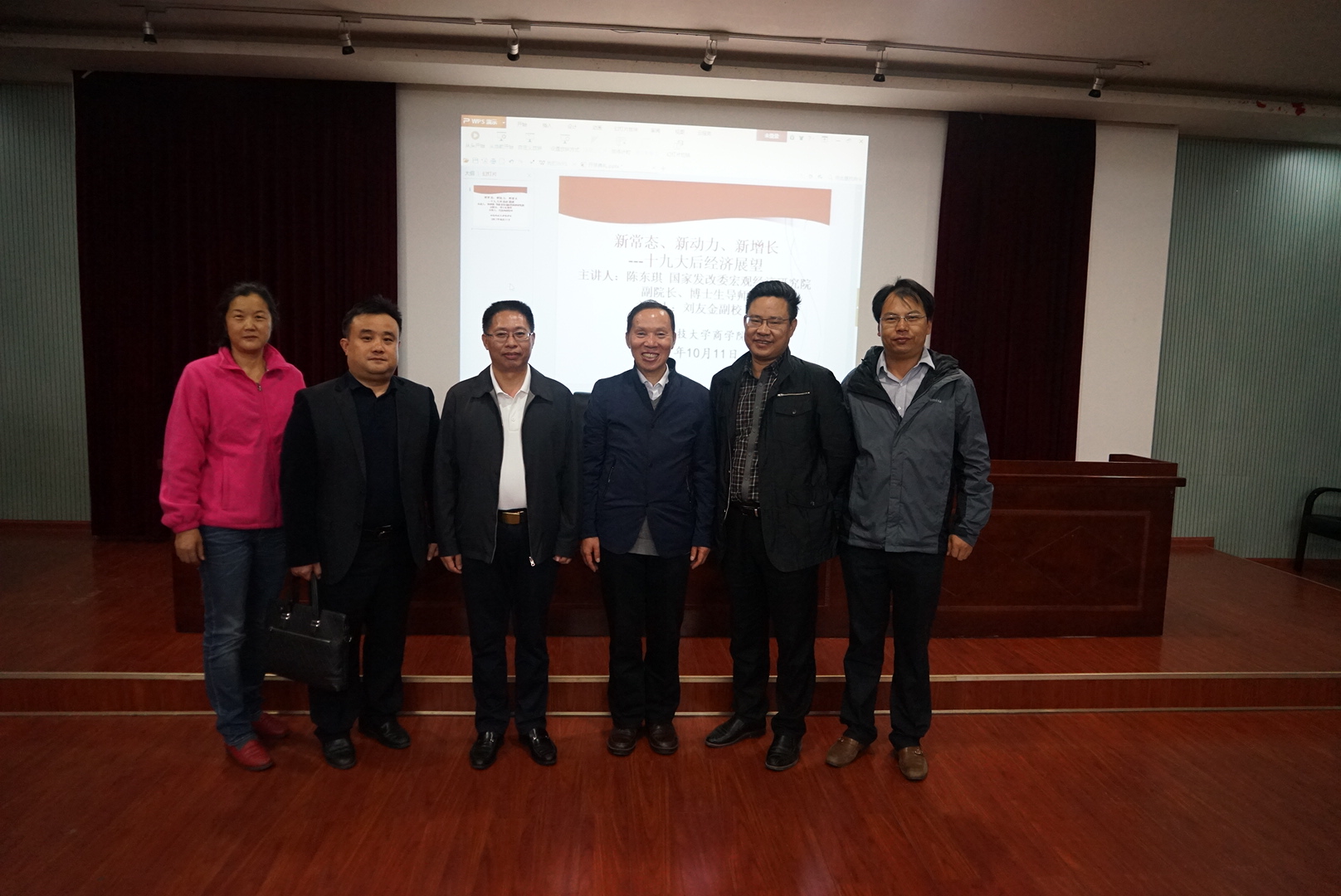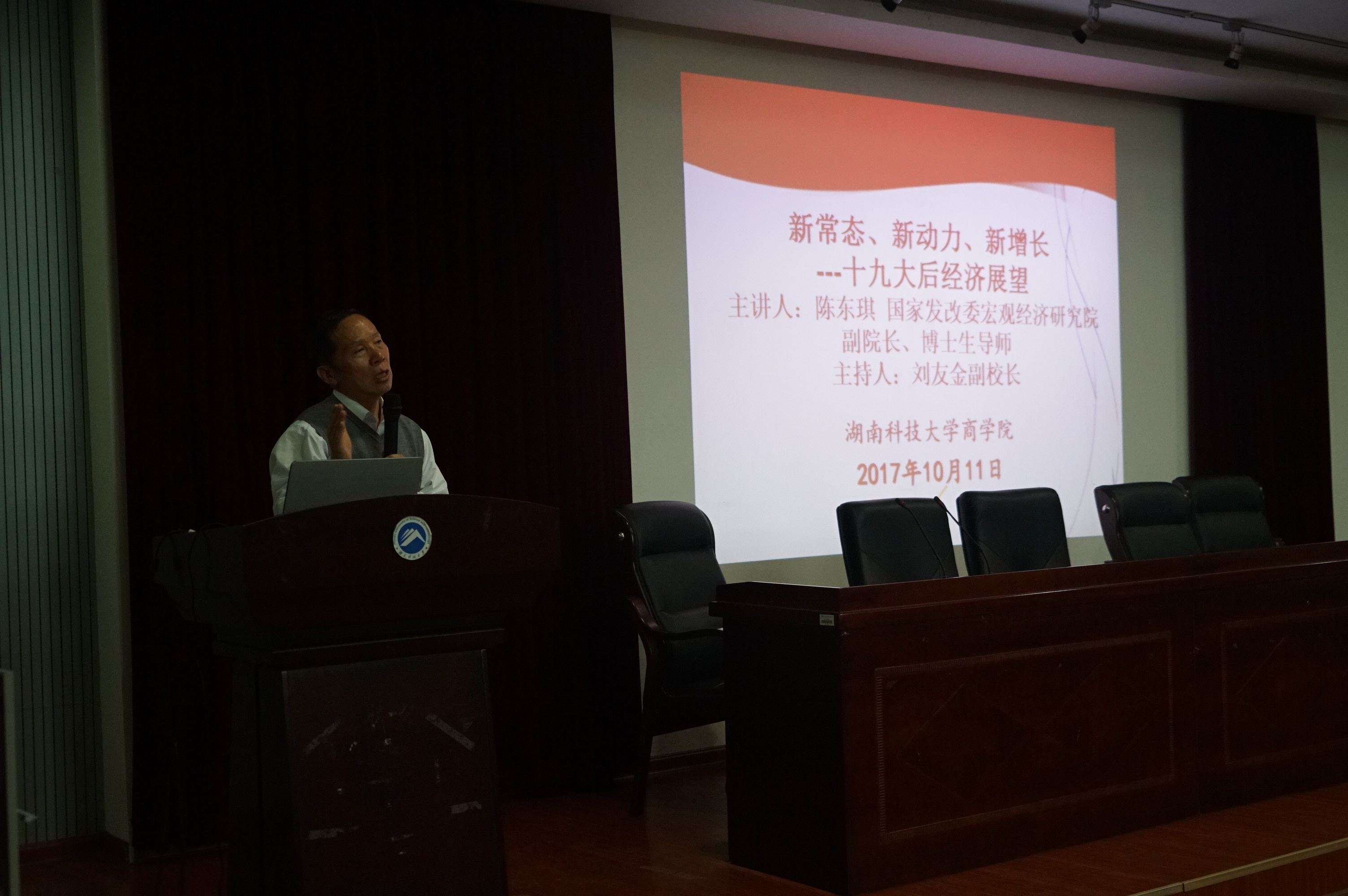 10月11日晚七点半,由国家发改委宏观经济研究院陈东琪教授主讲的“新常态,新动力,新增长——十九大后经济展望”学术讲座在三教101准时开始。会议由刘友金副董事长主持,校社科处处长向国成教授,yl23455永利潘爱民书记、贺胜兵副经理、颜剩勇副经理及多位老师参与了讲座。